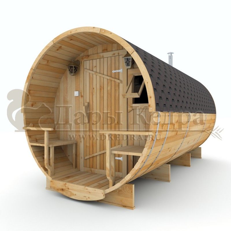 Баня-бочка круглая из кедра с верандой (все размеры) Это изделие круглой вытянутой формы. На веранде можно оставить вещи или отдохнуть после процедур парения. Лавочки из кедра находятся по всей длине бани-бочки с обеих сторон. Печь расположена в парилке около дальней стены. Время растопки такой печи не превышает 30 минут. В зависимости от выбранного размера круглая баня-бочка с козырьком имеет следующую комплектацию: Круглая баня-бочка 2,5 метра - парилка; Круглая баня-бочка 3,5 и 4,5 метра - раздевалка, парилка; Круглая баня-бочка 5,5 метров - раздевалка, парилка, моечная. По вашему желанию ее можно укомплектовать печью с внешней загрузкой, благодаря которой весь мусор вовремя топки остается на улице. Круглая баня-бочка не требует полноценный фундамент, поэтому при необходимости ее можно перенести в другое место. Обращаем Ваше внимание, что в стандартную комплектацию бани входят лавки в парной с обеих сторон. Дополнительно можно заказать полок открытого или закрытого типа! Кедр обладает ароматическими свойствами. Он не деформируется и влагоустойчив, при правильном уходе за деревом на нем не развиваются грибки и плесень.