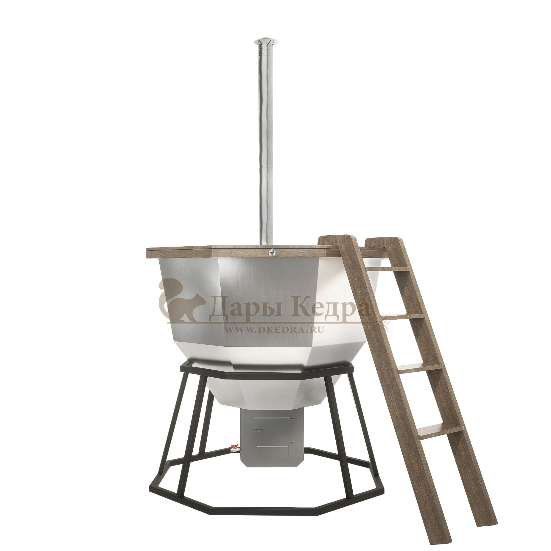 Банный чан из нержавеющей стали Ø-1750 на подставке Банный чан на подставке изготовлен из пищевой стали. Представляет собой большую ёмкость в виде чаши, при нагревании которой можно париться на свежем воздухе. Чан установлен на устойчивую металлическую подставку и оборудован кедровым бортом, скамейками, подспинниками, трапом для ног и приставной лестницей. Нагревание банного чана происходит от обычного костра. Если оборудовать данную модель печью, то банные процедуры можно принимать даже зимой.