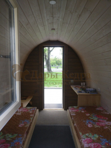 Такой кемпинг дом удобное и практичное решение для дачного использования или обустройства загородных баз отдыха. Изготовлен из хвойных пород древесины. Кровля из мягкой черепицы и цельный навес по всему фасаду изделия обеспечивают защиту от осадков. Домик включает в себя две спальные комнаты с четырьмя кроватями. По вашему желанию одно из помещений можно оборудовать под душевую зону с санузлом. Для удобства пользования в домике находится навесной столик, полка и вешалка. Входная дверь изготовлена из двойного стеклопакета.