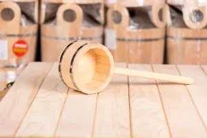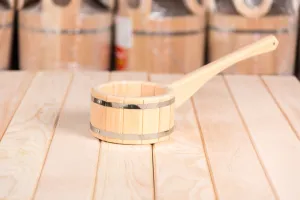 Деревянный ковш для бани из кедра это эффектный аксессуар. Он делает процессы парения и омовения тела более приятными и удобными. Вы удивитесь, но обычный деревянный черпак может служить не только для наполнения водой шаек или выплёскивания её на раскалённые камни – в сочетании с другими предметами, сделанными из природного материала, он формирует  в помещении неповторимый микроклимат.