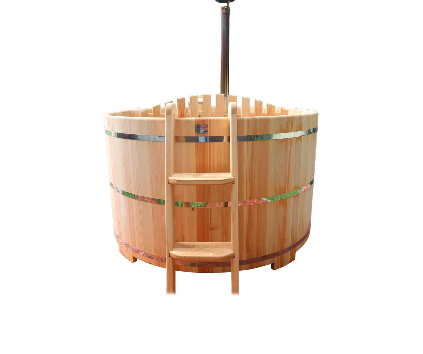 • Фурако круглая из кедра с внешней печью Это уличная баня, которой можно пользоваться круглый год. Купель представляет собой круглую емкость для воды, внутри которой располагаются сиденья из кедра. Подогрев воды осуществляется приставной печью с дымоходом. Для удобства пользования японская баня фурако оборудована внешней и внутренней лестницей из кедра. Целебная древесина кедра богата фитонцидами и эфирными маслами, которые активируются при нагревании. Таким образом, во время процедур парения организм насыщается полезными веществами.