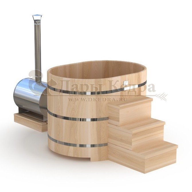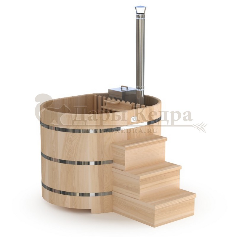 • Фурако овальная из кедра с внешней печью Это уличная баня, которой можно пользоваться круглый год. Купель представляет собой овальную емкость для воды, внутри которой располагаются сиденья из кедра. Подогрев воды осуществляется за счёт внешней печи с дымоходом, которая подключается с помощью шлангов с выходом внутри термостойких форсунок. Для удобства пользования японская баня фурако оборудована внешней и внутренней лестницей из кедра. Целебная древесина кедра богата фитонцидами и эфирными маслами, которые активируются при нагревании. Таким образом, во время процедур парения организм насыщается полезными веществами.