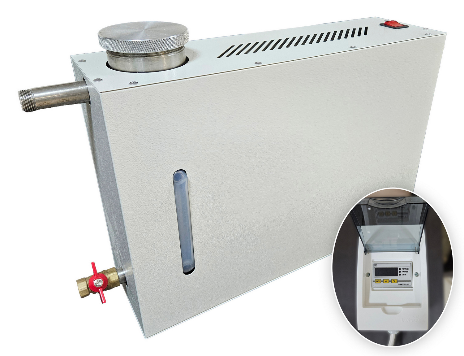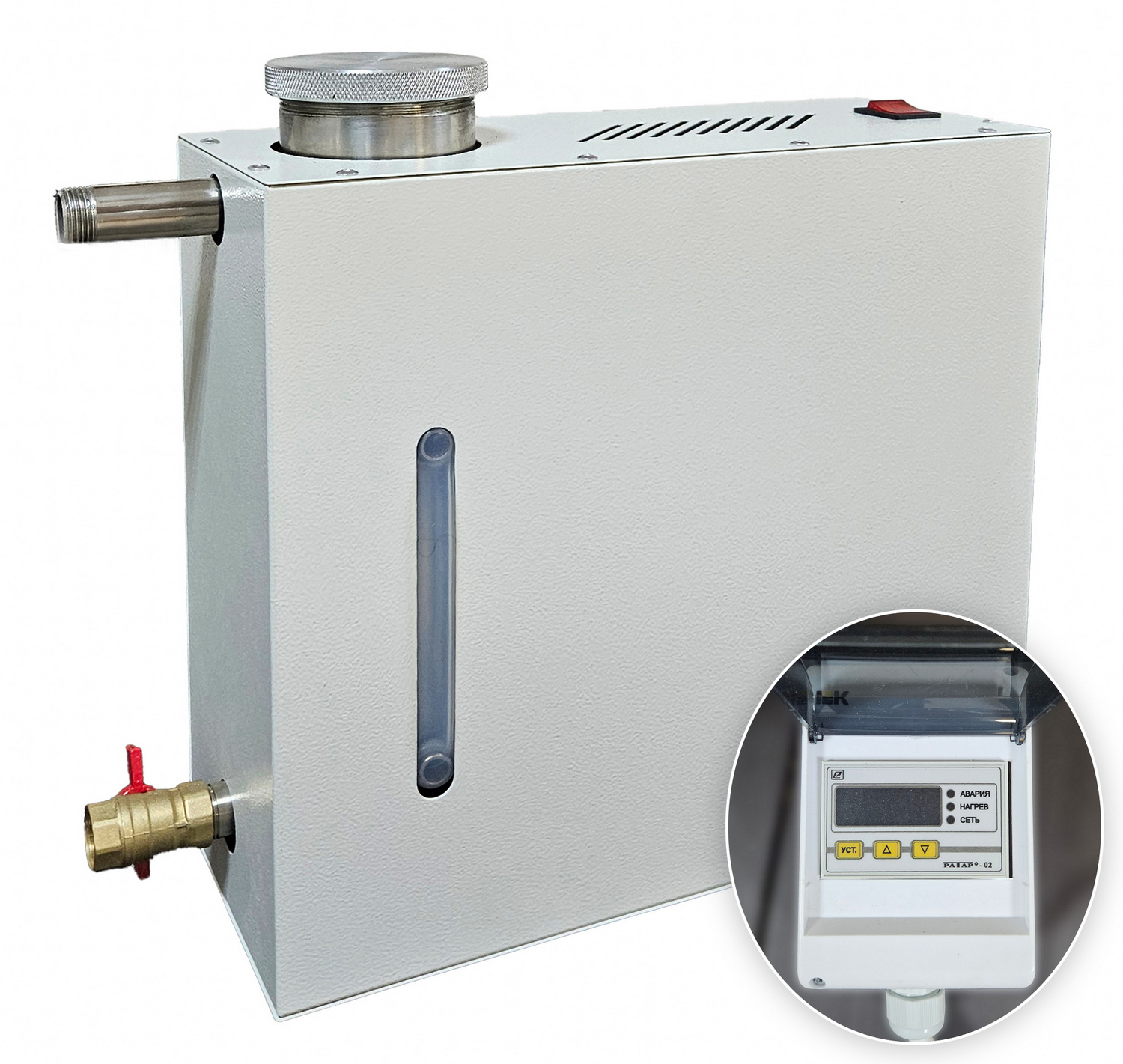 Парогенератор накопительный, 1,6 кВт с встроенным цифровым пультом управления Прибор служит для создания пара путем закипания воды. В металлическом корпусе парогенератора находится бак для воды со съемной аромаемкостью в виде сеточки. Рядом располагается индикатор в виде трубки, благодаря которому осуществляется визуальный контроль за уровнем воды. Парогенератор накопительного типа работает от электричества и не требует подключения к водопроводу. Вода в него добавляется самостоятельно. Управление парогенератором осуществляется за счет встроенного пульта, с помощью которого устанавливается температура, мощность и время процедур парения. При превышении заданной температуры и низком уровне воды устройство отключается автоматически. Целебный пар поступает в фитобочку по паропроводу и насыщает организм человека полезными веществами.