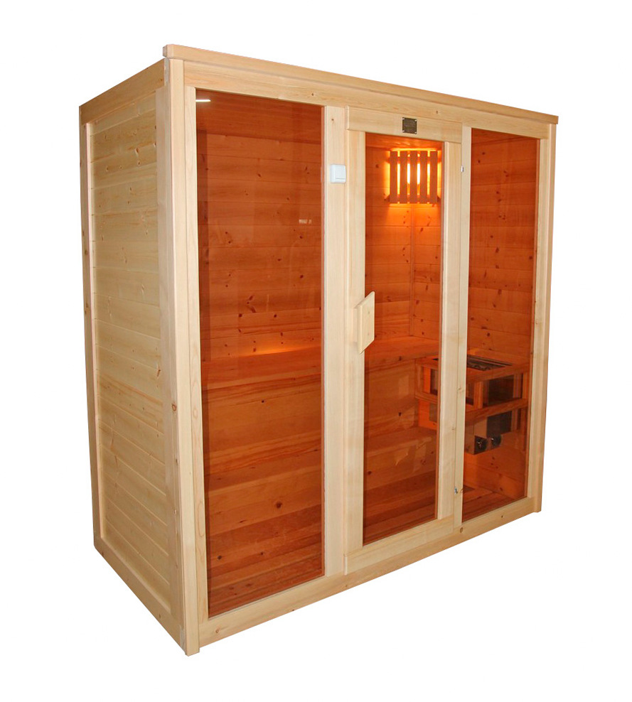 • Двухместная финская сауна кабина из кедра и липы с электрокаменкой Это специально оборудованная готовая деревянная кабина для сухого и влажного парения. Электропечь нагревает пространство внутри и позволяет сбрызгивать камни водой, слегка увлажняя воздух. Такая процедура позволяет избежать перегрева. Сауна обшита снаружи и внутри вагонкой из липы и имеет теплоизоляционный слой. Финская сауна с электропечью подойдет, как для домашнего использования, так и для коммерции. Доставляется в разборном виде щитами, собирается по инструкции с помощью шуруповёрта. Обращаем Ваше внимание, что в стоимость сауны уже включена дверь с закаленным стеклом в раме из кедра с фиксатором и деревянным фасадом справа. Вы можете заменить фасад на цельностеклянный с безрамной дверью за дополнительную плату